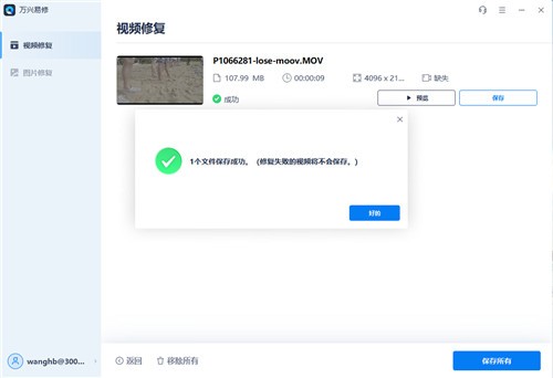 所有视频都完成修复后,点击“保存所有”按钮,一次性将所有视频保存到指定路径,还是要注意不要将视频保存回原存储路径,防止文件破坏。